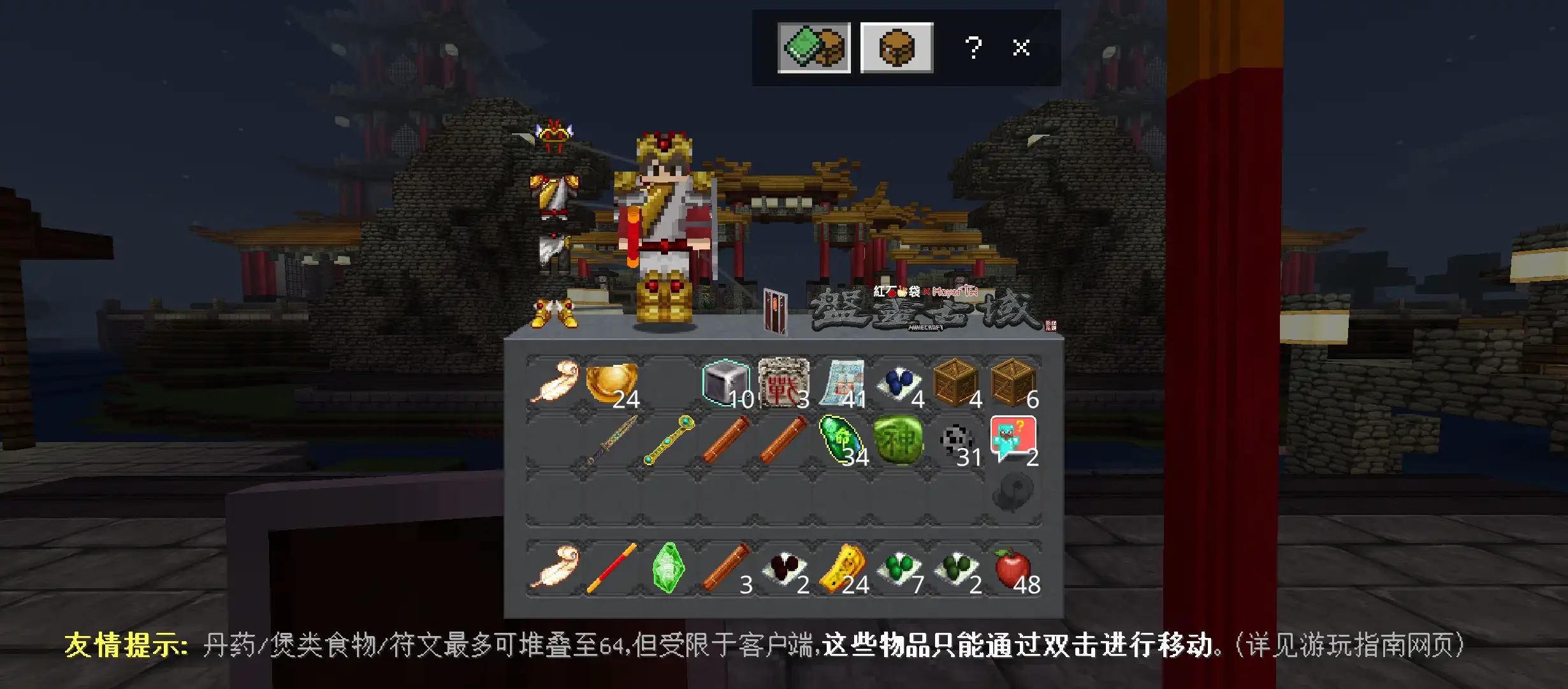 - 丹药、退火符、击退符、佛跳墙、万春羹、兔肉煲可叠放,上限为 64,且基岩版同样支持